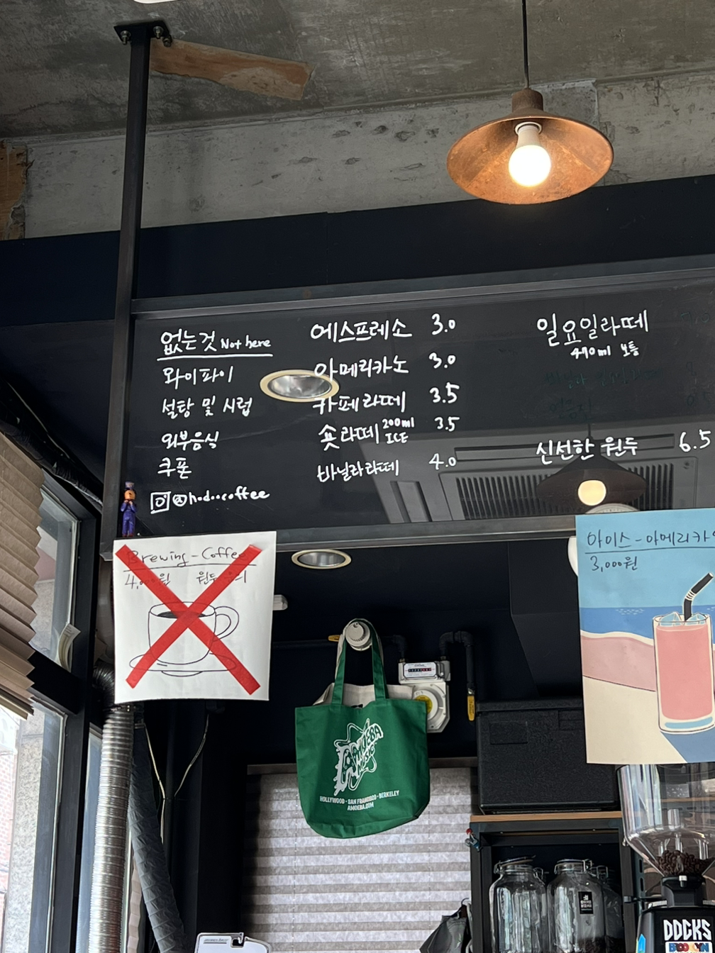 오늘 연차를 내고 머리를 자르러 가는 길에 열었길래 들렀다. 아메리카노가 3000원인 요즘 보기 드문 가게다.