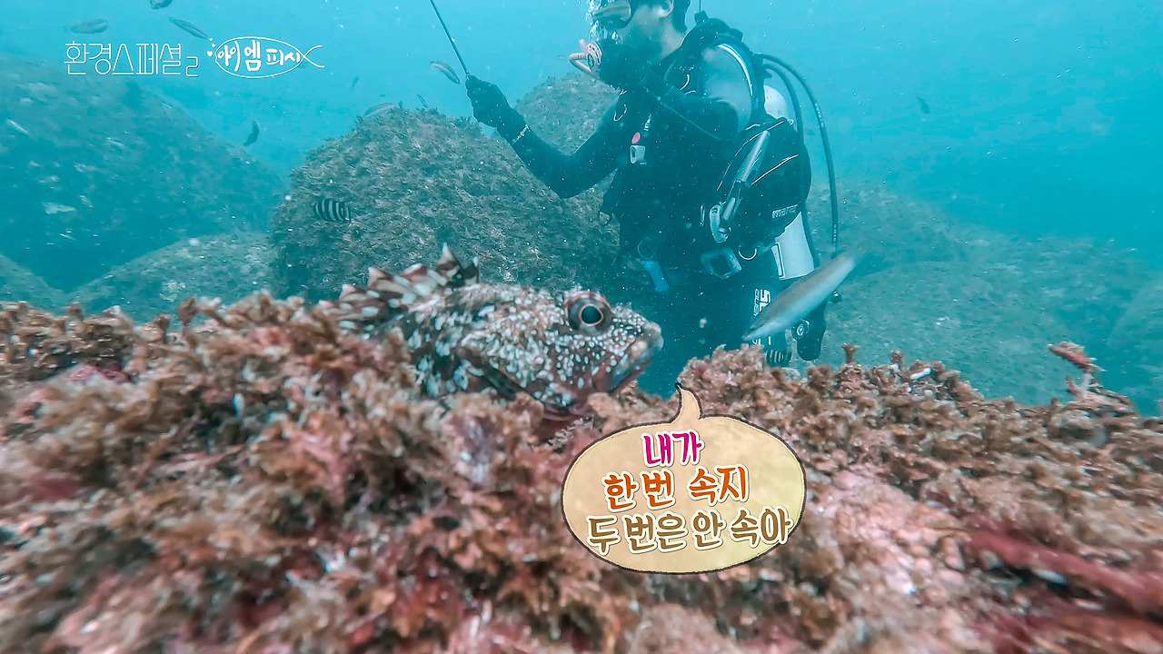 최종적으로 나의 선택을 받은 물고기는 바로 쏨뱅이Sebastiscus marmoratus였다. 쏨뱅이는 바닥에 붙어살지만 먹이를 사냥할 땐 굉장히 날렵하고 몸집에 비해 큰 먹이도 한입에 삼키는 먹성 좋은 물고기이다. 낚시꾼이 잡아 올린 쏨뱅이 입에서 바늘을 빼다가 지느러미 가시에 찔려 쏨뱅이를 물에 떨어트린 후 그 물고기에게 같은 미끼를 보여주면 어떤 반응을 보이는지 보는 장면으로 일부 연출을 했다.