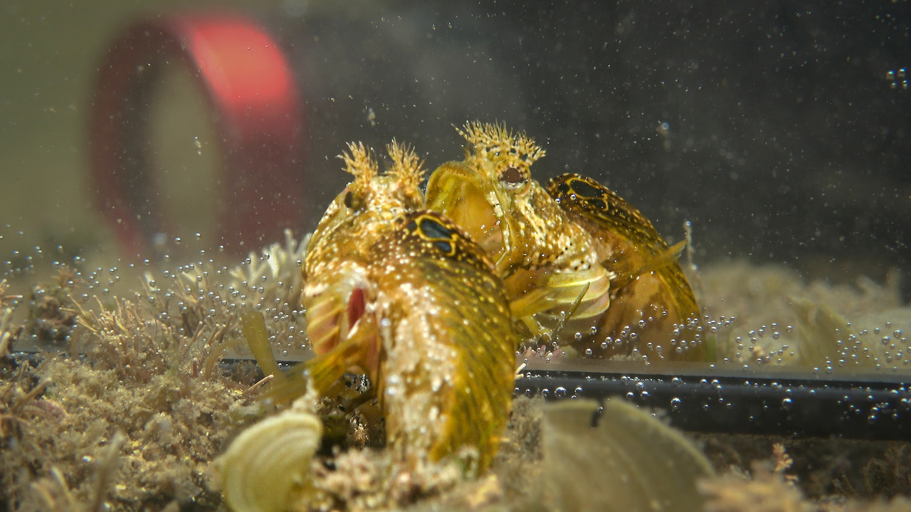 거울 속 자신과 싸운다는 것이 확실하게 보이는 물고기들도 있는데 대표적인 것이 비늘베도라치Neoclinus bryope다. 비늘베도라치 또한 저울베도라치나 대강베도라치처럼 몸이 길쭉하고 큰 입을 가지고 있는데 바위 위 조류를 뜯기 위해 아래를 향한 그들의 입과 달리 비늘베도라치의 입은 좀 더 앞을 향해있고 눈 뒤에까지 입이 벌어져 사납게 보이는 인상이다. 둥지를 지키는 비늘베도라치는 수중사진가들이 즐겨 촬영하는 모델이 된다. 카메라를 밀착시켜도 도망가지 않고 비교적 정면을 향한 눈과 머리에 사슴뿔 같은 돌기까지 있어 재미있는 얼굴 모습이 사진에 담기기 때문이다. 수컷 비늘베도라치가 차지하고 있는 둥지에 다른 수컷 경쟁자가 나타나면 둘 사이에 싸움이 일어난다. 둘은 입을 최대한 크게 벌려 서로 입술을 맞대고 겨룬다. 힘도 힘이지만 입이 큰 쪽이 이기는 것이다. 짓궂게 거울을 둥지 앞에 놓아 보았다. 수컷은 둥지 밖으로 나와 입을 크게 벌려 거울 속 경쟁자와 입 크기 대결을 벌였다. 막상막하 어느 한쪽도 물러설 수 없는 싸움이 펼쳐졌는데 한참 동안 승부가 나지 않자 결국 휴전에 들어갔다. 아니면 경쟁자가 아니라 자신의 모습이라는 것을 깨달은 것일 수도 있다.