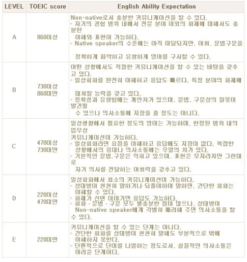 토익 주관사인 미 ETS에서 토익 등급을 5등급으로 나누고 등급별로 기대하는 영어실력에 대한 정의를 아래와 같이 내어 놓았다.