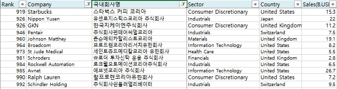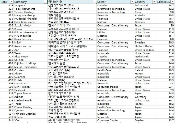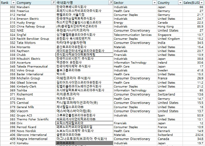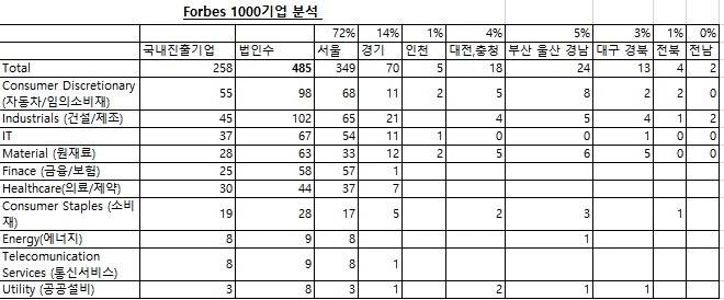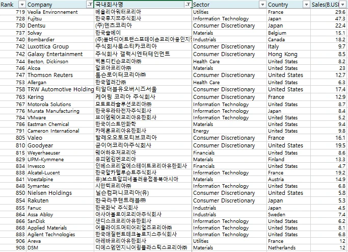 미국의 경제지인 Forbes에서는 해마다 기업들의 매출, 영업익, 자산규모, 브랜드 가치 등을 검토하여 기업들의 순위를 매기고 있다. 이름하여 Forbes global 2000! 이 리스트의 기업들 중 상위 1000개 기업들을 뽑아서 그중 국내에 진출한 기업들을 찾아보았고, 리스트는 2014년도에 작성된 것을 기준으로 하였다.