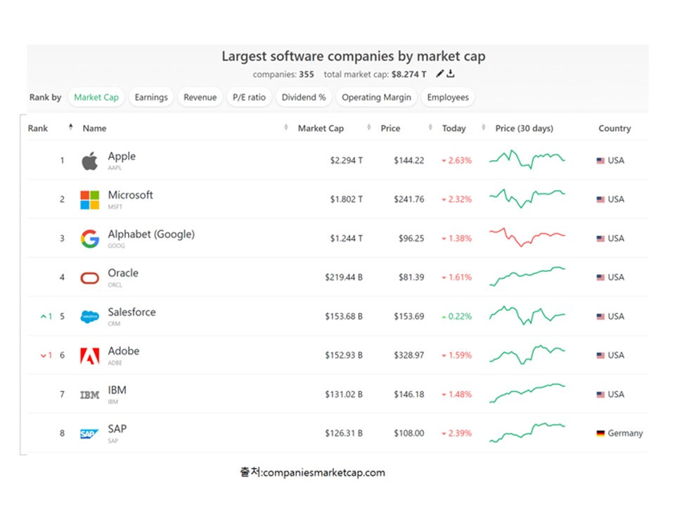 어떤 회사일까? 아래는 시가총액기준 글로벌 Top 8 software기업들이며, 이 중 하나이다.