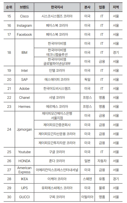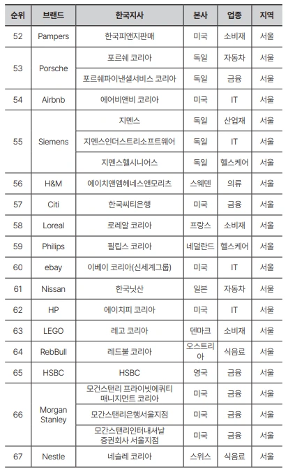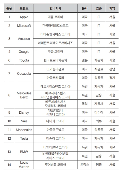 애플, 마이크로소프트, 아마존, 구글, 도요타, 코카콜라, 벤츠, 나이키, 맥 도날드, 테슬라, BMW, 루이비통, 페이스북, 샤넬, 에르메스, 유튜브, 이케 아, 구찌, 펩시, 넷플릭스, 아디다스, OB맥주, 네슬레, 폭스바겐, ZARA, 스 타벅스, 포르쉐, Airbnb, 로레알, 이베이(G마켓, 옥션), HP, 닌텐도, 스포티파 이, 까르띠에, 페라리, Dior, 티파니, 프라다, KFC, 하이네켄, 버버리와 같 은 일상에서 만나는 기업들이며,