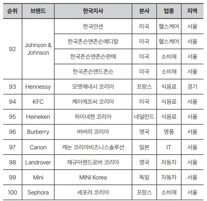 인터브랜드 선정 세계 100대 브랜드중 국내에 진출한 외국계기업들