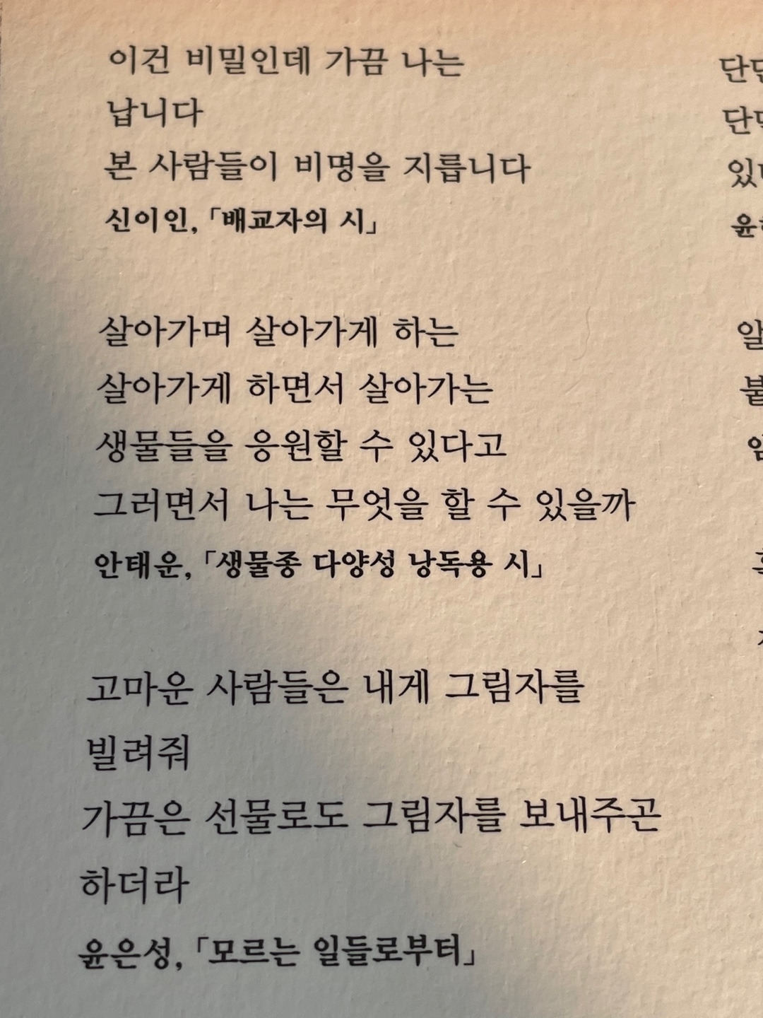 시를 읽을 때 감정이 구체화되는 것을 느낀다. 망가져 가는 세상에서, 이건 그냥 치료받아야 할 나쁜 우울인가 생각되다가도 시를 읽을 때면 그런 슬픔의 언어가 시인에게, 우리에게 남아 있어 다행이라 생각한다. 이 책에 실린 윤은성 시인의 산문 ‘환대를 기억해두려는 마음’에는 이런 문장이 있다.