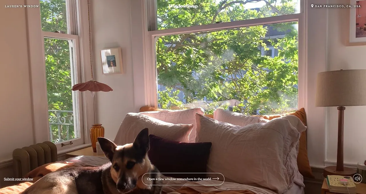 미국 샌프란시스코의 어느 집에는 창문 앞에 개가 늘어져 있습니다. 커다란 통창 앞에 침대가 놓여 있고 셰퍼트종으로 보이는 큰 개가 침대에 누워 하품을 하고 있습니다. 클릭해서 보니 이 창문은 ‘로렌’의 집이라고 하네요. 창문 앞에 가로수가 드리워져 햇빛과 초록색이 어우러진 집에 사는 로렌은 어떤 사람일까요. 비록 서울의 저는 밤 10시에 원고를 쓰고 있지만, 모니터 속 샌프란시스코는 대낮이고 이름을 알 수 없는 큰 개가 침대에 누워있으며, 그 집에 사는 누군가가 샤워 중입니다. 녹화 영상인데도 동 시간에 로렌과 공간을 공유하고 있는 기분이 듭니다.