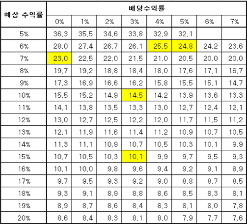 참고로 테이블에서 예상 수익률 6%, 배당 수익률 4 ~ 5%에서 익숙한 25배 근처의 값들이 보이는데 4% 룰과 조건이 비슷하기 때문이다.