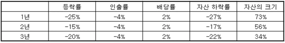 다음 상황을 가정해 보자. 1년 동안 시장 -25%, 다음 1년 동안 -15%, 그다음 1년 동안 -20%라고 생각하고 배당수익률 2%, 매년 인출률 4%를 가정하면 총자산은 3년 뒤에 총자산은 1/3로 축소되어 있을 것이다. 대략적으로 계산해 보면 다음과 같다. 인출률은 실제로는 (-) 복리효과를 나타내지만 여기서는 단리로 계산했기 때문에 실제 하락폭은 아래의 계산보다 더 크다.