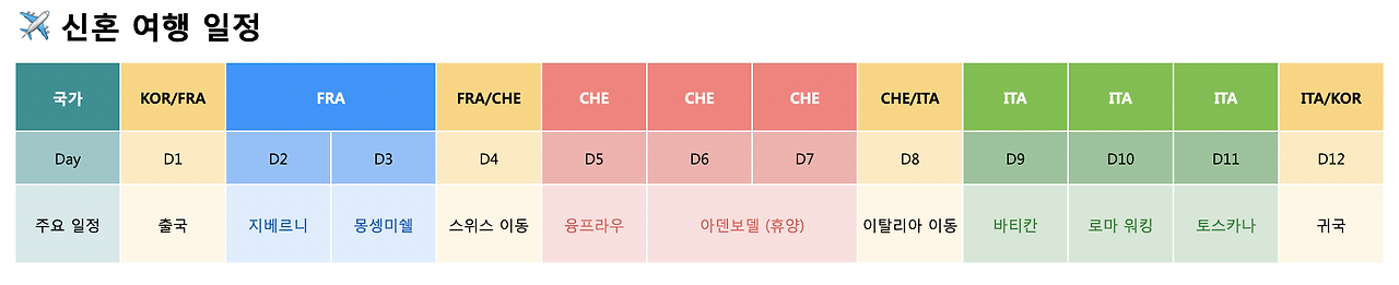 신혼여행은 유럽으로, 현지의 숨결을 피부로 느낄 수 있게 일정에 "빡빡함"을 많이 가미했다. 그리고 혹시나 여행 중 고단함으로 발생할 수 있는 감정 쓰레기들을 배출할 수 있도록 스위스에서의 "널널함"을 넣는 것도 잊지 않았다.