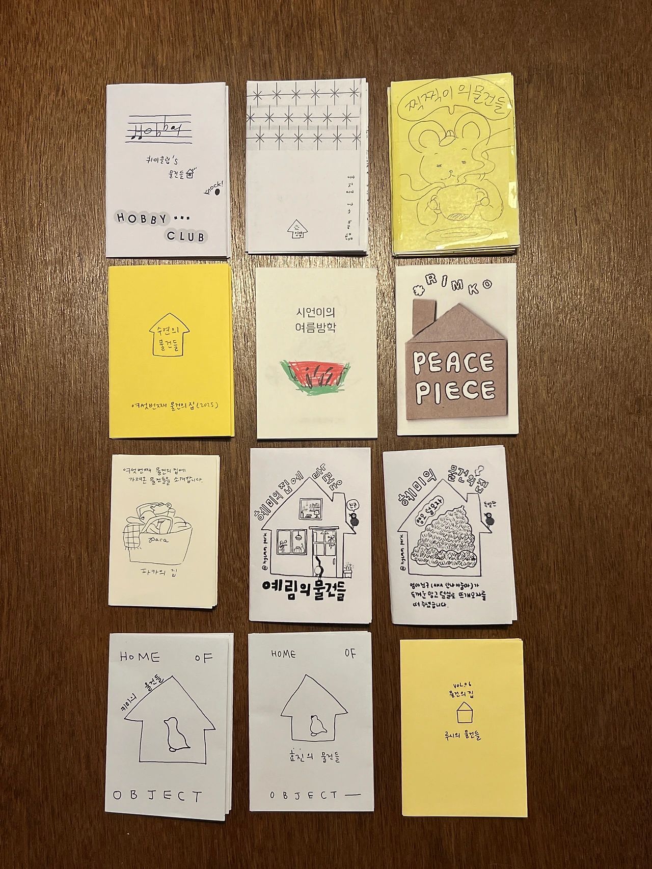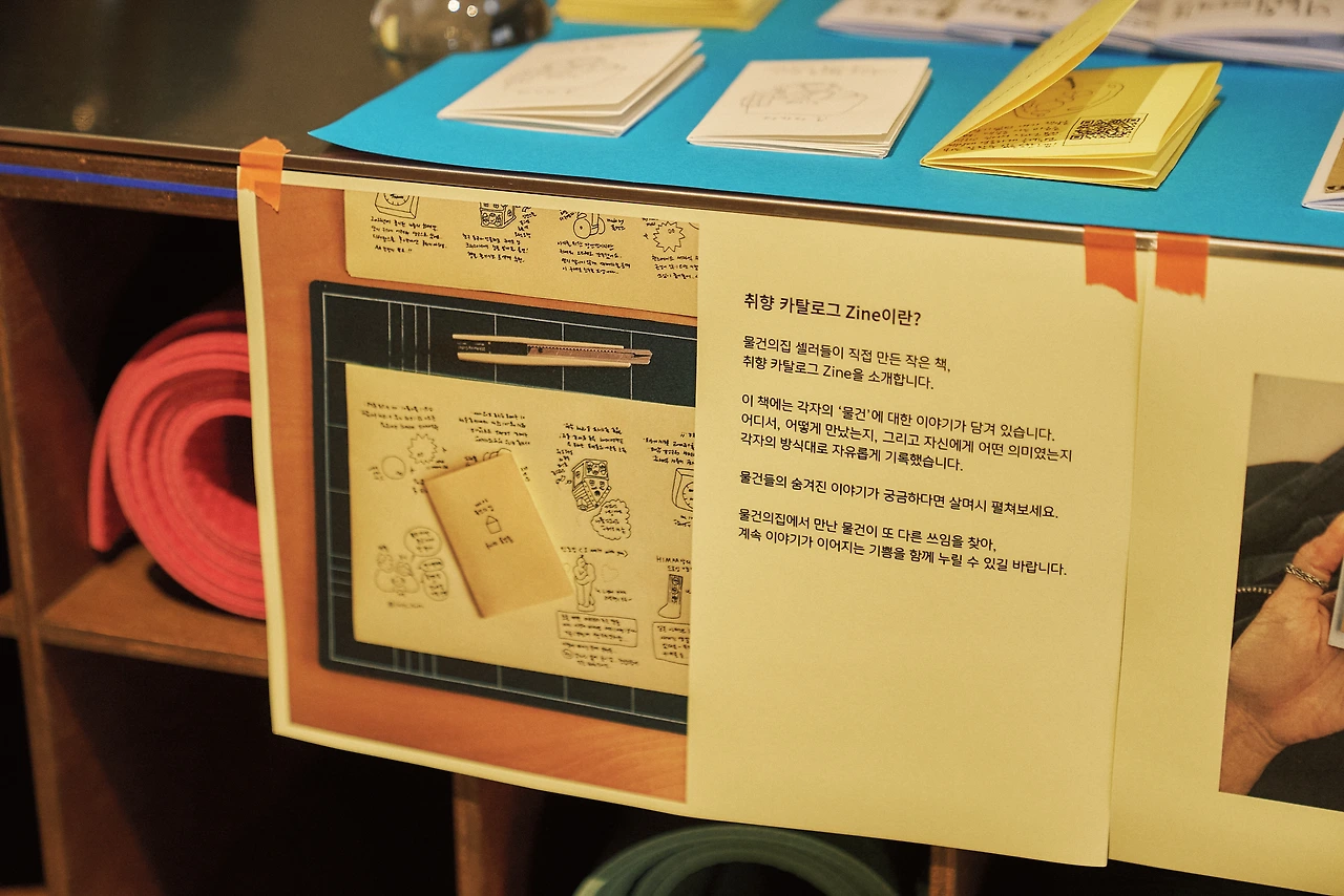 작년에 다섯번째 물건의집을 끝내고, 림고언니와 통화하다가 아이디어를 얻었던 '취향 카탈로그 Zine 만들기'를 시도했다. 물건의 집 플리마켓 셀러들이 미리 서로 교류하는 시간이 있으면 좋겠다는 생각과, 물건이 단순히 팔고 없어지는 게 아니라 셀러 자신에게도 남는 기념품이 있으면 좋을 것 같다는 마음으로 기획한 프로그램이었다. 만든 Zine은 각 셀러 자리에도 두고, 마켓 입구 쪽에 배치해 두어 작은 Zine 모음 전시를 했다.