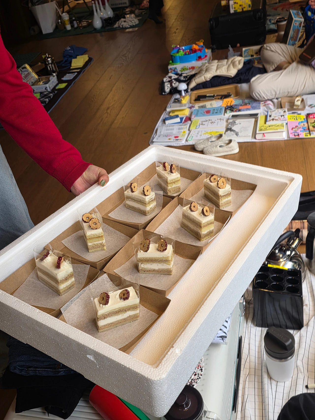- 고급진/귀여운 간식이 많았어요. 만들어주신 케이크도 엄청 맛있었고, 플랜디 님이랑 쩡이야네 손님분이 사다주신 간식도 짱맛이었고... 셀러들끼리 나눈 간식, 개인적으로 받은 간식 등등. 물건의집과 서로를 아끼는 마음이 달달구리로 전해지는 것 같아 즐거웠어요.