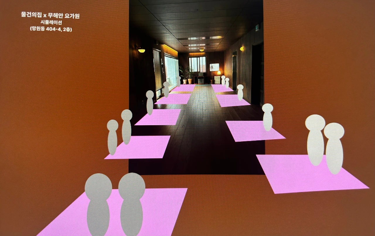 여섯번째 물건의집이 열린 망원동 무해안의 건물은 1976년에 지어졌는데, 1층은 오랫동안 동네의원 ‘윤진열소아과의원'이었고, 2층은 의사 선생님 가족들이 지냈던 보금자리였다. 직전에는 카페로 운영되었다가 이제 ‘무해안(@moohaean.yoga)’이라는 이름으로 1층은 한의원, 2층은 요가원이 되어 몸과 마음의 회복되는 공간이 되었다. 1층에는 작은 마당과 휴게시설이, 3층에는 넓은 옥상이 있어서 플리마켓 외에도 카페 약수터의 팝업과 야외 재즈공연, 트리코나클럽에서 옥상 원데이 요가 프로그램이 열렸다.
