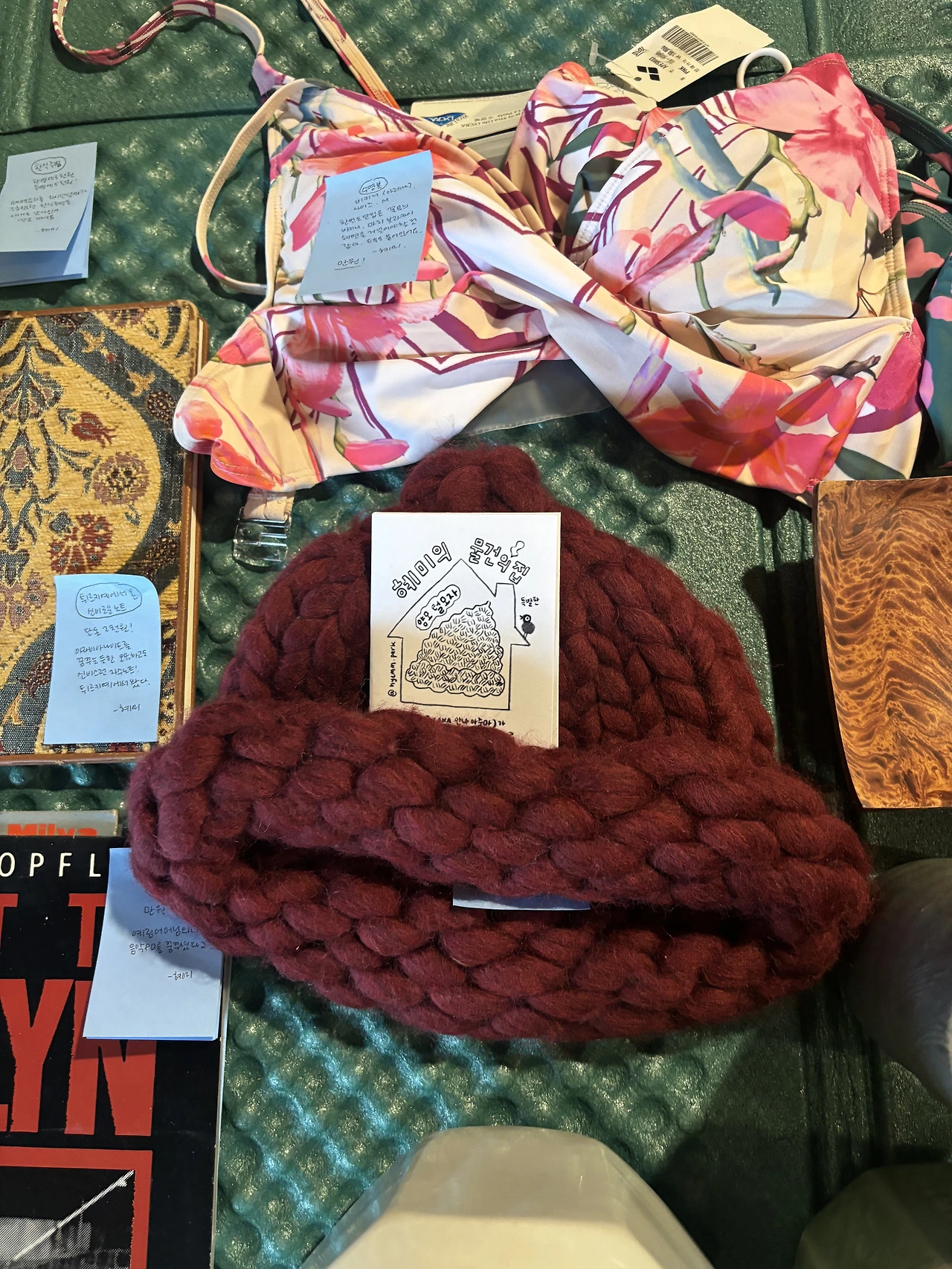이번에는 마켓이 끝나고도 덜 힘든 느낌이 들었는데, 왜그럴까 생각해보니 스텝역할을 맡아준 동규, 주영, 유진, 형철, 시언이 덕분인것 같아요. 진짜 최고로 고마운 마음이 들어요. 돗자리를 깔고 신발을 벗어 들어오는 공간에서 한 것은 처음인데 오히려 더 아늑하고 대화나누기도 좋았어요. 특히 저는 림고와 작은 방에서 판매했는데 그 공간이 약간은 외진것 같다가도 오히려 느긋한 바이브로 판매할 수 있어서 좋았던 것 같아요. 물건을 엄청 많이 들고 갔는데, 거의 다 판것도 뿌듯했습니다. 물건이 딱 어울리는 새로운 주인에게 갈때 기쁜 마음이 들었습니다.