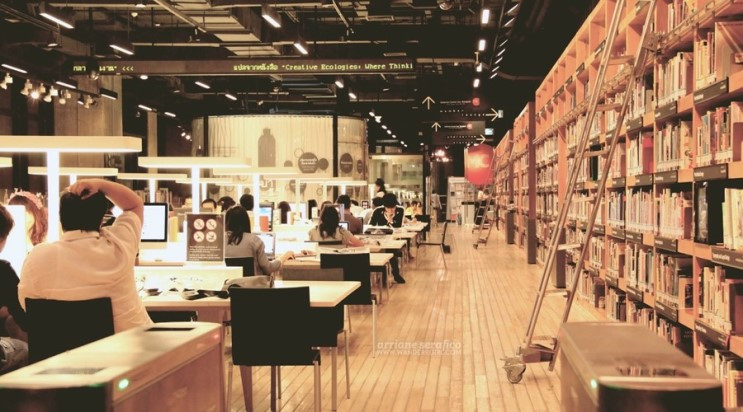 와. 홈페이지에서 보자마자 '여긴 꼭 가야겠다' 찜해둔 곳. 태국에 이런 곳이 있었다니! 디자인, 건축, 광고, 브랜드, 애니메이션, 미술 역사 등 다양한 분야의 서적들이 방대하게 존재하는 공간. 그야말로 영감으로 가득 찬 곳이다. 현지 사람들도 오랜 시간 머무면서 노트북으로 자신의 작업과 독서를 하더라.