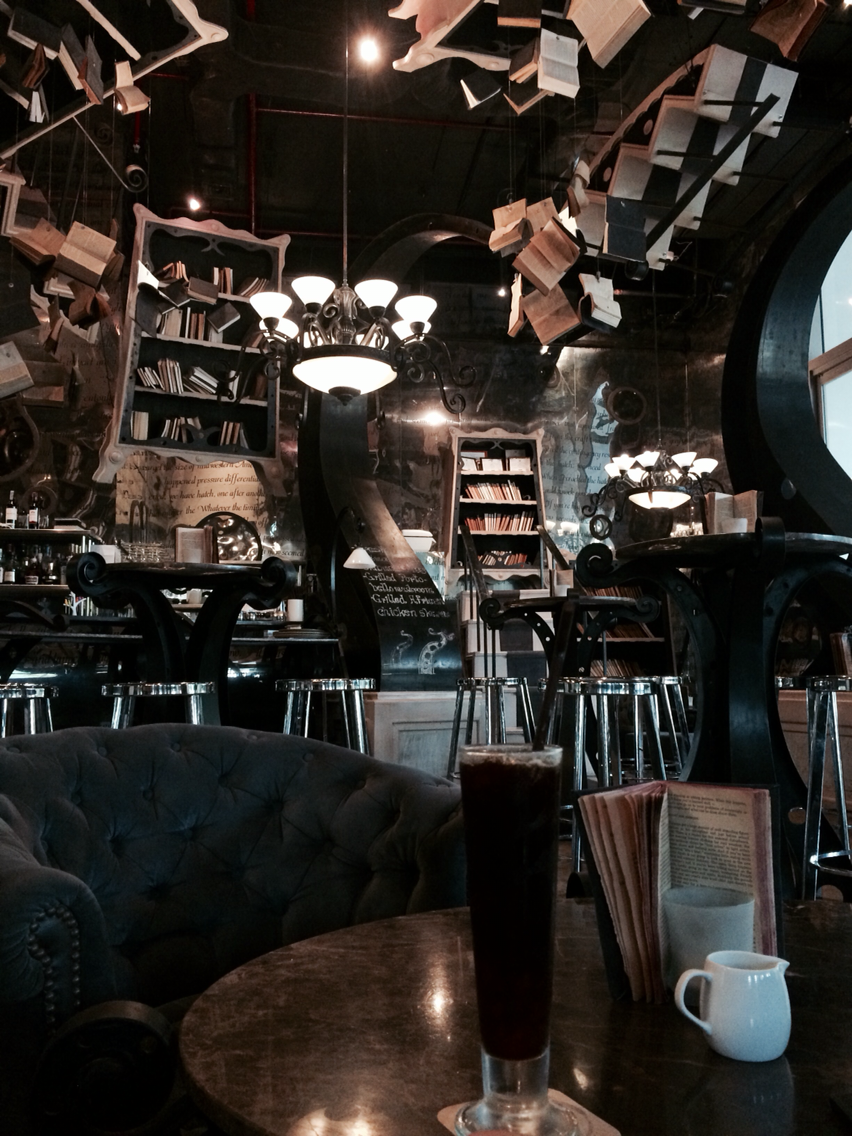 커피를 마시며 앉아 있는데, 위아래로 움직이는 책을 구경할 수 있었다. 다른 공간과 달리 책을 소재로 독특하게 구성한 인테리어 덕분에 눈이 즐거웠던 공간.