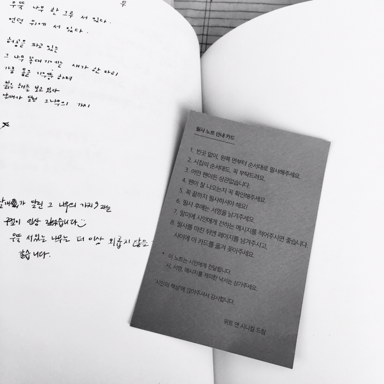 무엇이든지 잘 운영되게 만들기란 어려운데, 이 시인의 책상이 잘 운영될 수 있는 건 이 작은 카드 덕분이다. 이 안내서를 보고, 모두들 정성스럽게 순서대로 차곡차곡 채워간다. 함께 쌓아가는 느낌이 이렇게 뿌듯할 수가. 무언가의 동질감은 덤이다. 덕분에 나도 시를 정성스레 옮겨 적어본다.