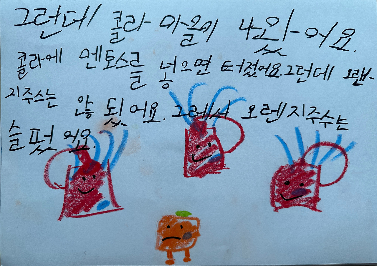 그런데 콜라 마을이 나왔어요. 콜라에 멘토스를 넣으면 (팡! 팡! 하고) 터졌어요. 그런데 오렌지 쥬스는 안되었어요. 그래서 오렌지 쥬스는 슬펐어요