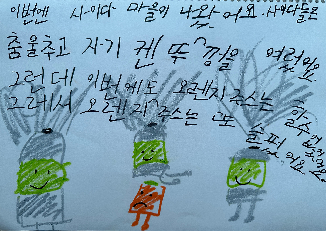 이번엔 사이다 마을이 나왔어요. 사이다들은 춤을 추고 자기 캔 뚜겅을 열었어요. (격렬하게 춤을 추고 뚜겅을 열자 사이다가 폭포처럼 하늘을 향해 터져나왔어요.) 그런데 이번에도 오렌지 쥬스는 할수 없었어요. 그래서 오렌지 쥬스는 또 슬펐어요.