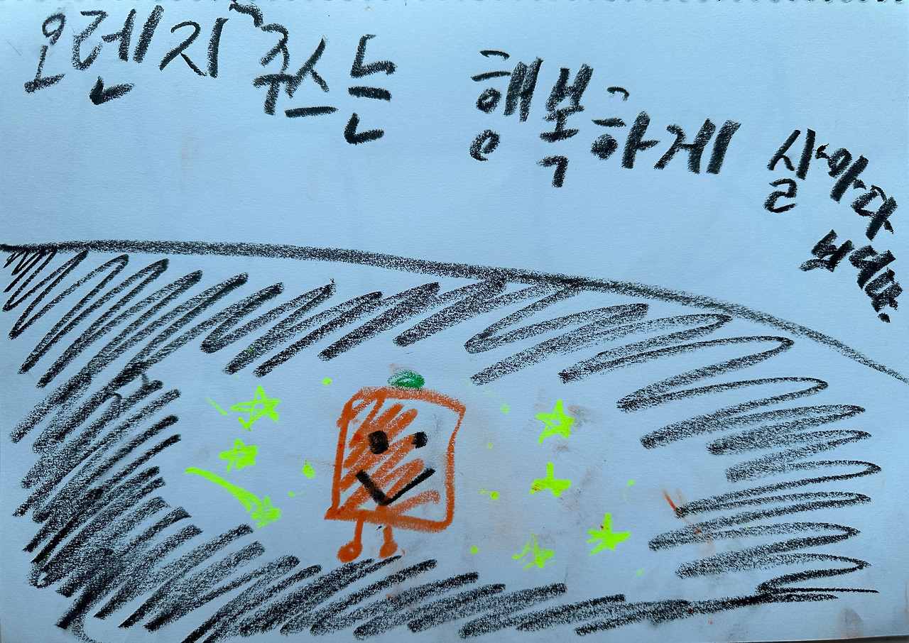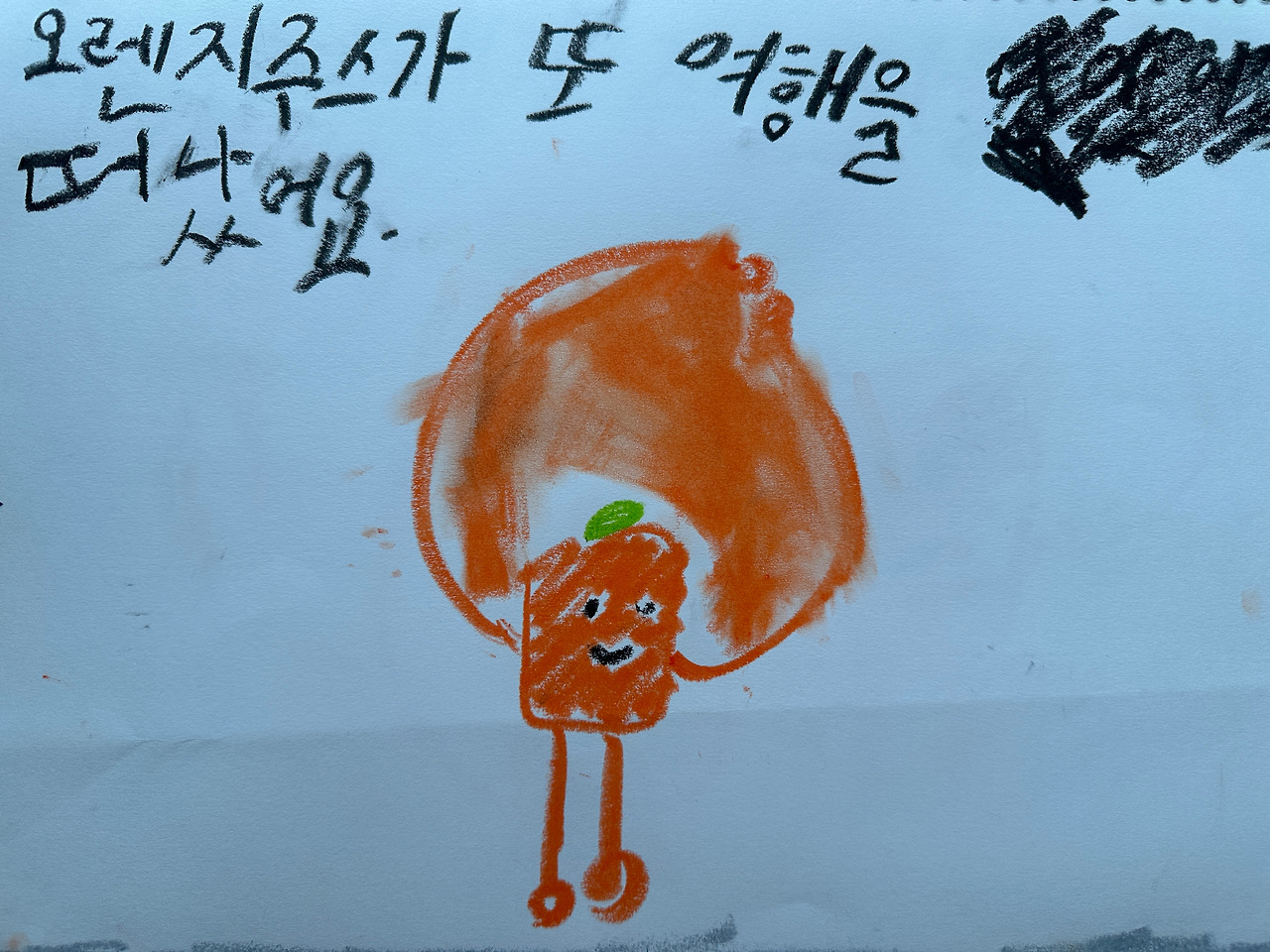 오렌지 쥬스는 여행을 떠나기로 결심했어요. (동생이 ‘내 마음’이라고 편지를 써서 줬는데 모르고 버려버리고 여행을 가버렸어요)