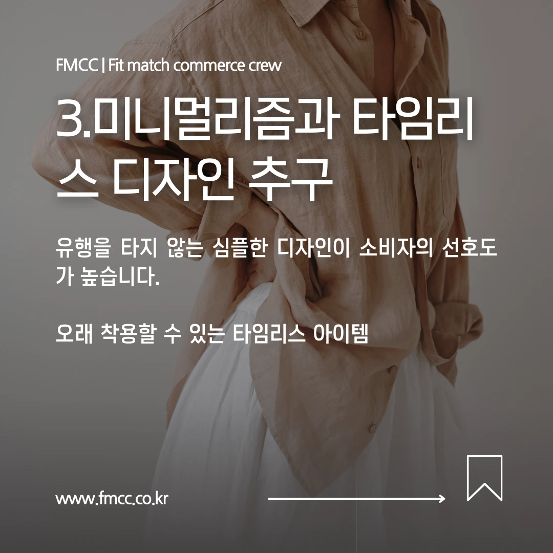 패션에서 트렌드를 쫓기보다는 오래 입을 수 있는 타임리스 디자인이 소비자들에게 인기를 끌고 있습니다. 유행을 따르기보다는 간결하고 클래식한 스타일을 선호하는 소비자들이 늘어나고 있기 때문이죠. 특히, 기본 아이템에 투자하는 소비자들이 많아짐에 따라 브랜드는 ‘미니멀리즘’과 ‘타임리스’ 디자인을 통해 소비자에게 가치를 전달할 수 있습니다.