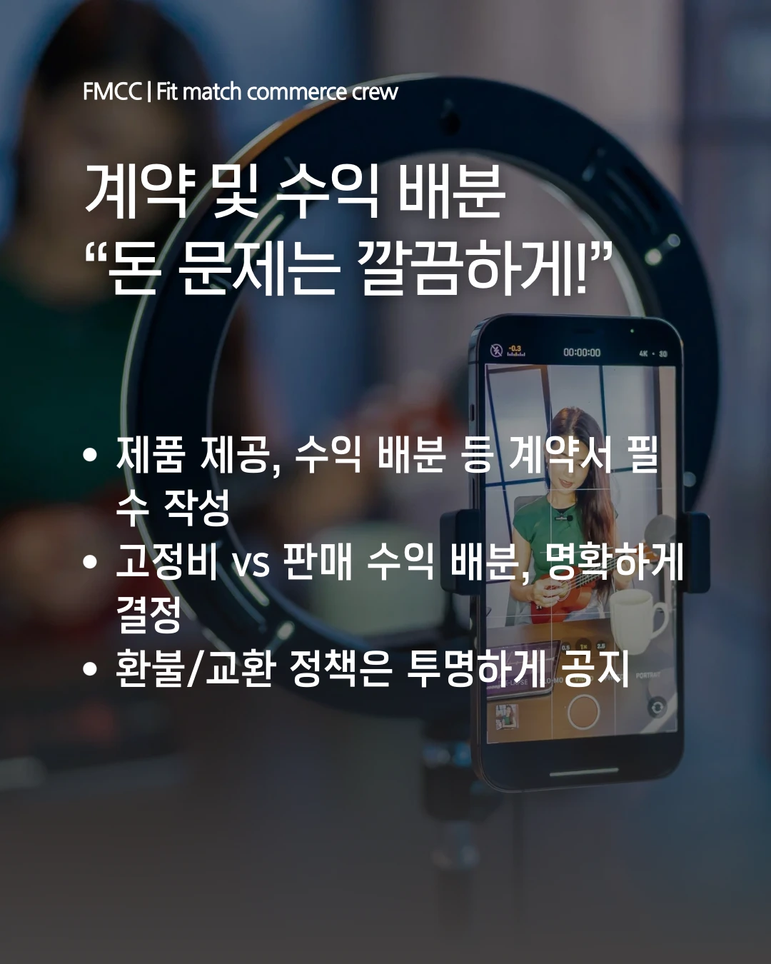 제품 제공 방식, 수익 배분율, 콘텐츠 제작 횟수, 홍보 기간 등 모든 조건을 계약서에 명확히 명시하는 것이 필수입니다. 고정 비용(예: 콘텐츠 제작비)을 지급할지, 아니면 판매 수익의 일정 비율을 인플루언서에게 지급할지를 사전에 명확히 결정해야 합니다.