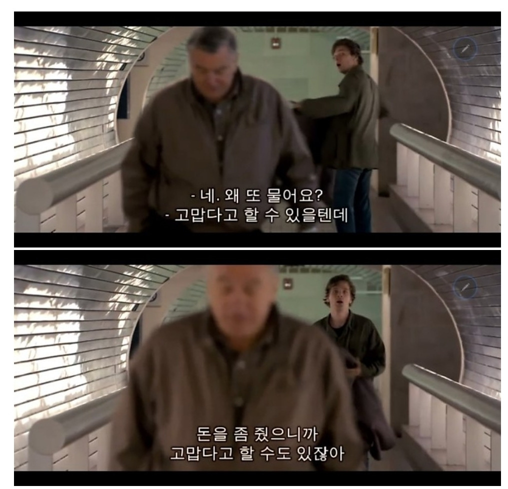 프랭크가 자식을 찾아가던 중 지하보도에 쓰러져있는 청년을 보게 됩니다. 건드리지말라는 그에게 빵을 사먹으라고 돈을 주죠. 여기서부터 문제가 발생합니다. 그냥 돈을 주고 갔으면 좋을텐데 프랭크는 청년에게 호의에 대한 댓가로 "고맙다"는 인사를 강요한거죠. 그 결과 청년은 프랭크의 남은 돈까지 빼앗으려 하고 실랑이를 벌이다 프랭크의 심장약까지 부숴버립니다.