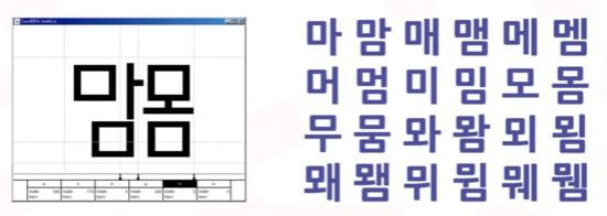이 문제를 해결하기 위해 저희는 서체를 만들 때 ‘맘’과 ‘몸’을 가장 먼저 만듭니다. ‘ㅁ’이 한글의 가장 기본적인 형태이면서 동시에 크기를 좌우하는 자음이거든요. 서체의 골격이 된달까요? 반대로 영문을 만들 때는 ‘H'를 제일 먼저 만들어요. 딱 잡아주는 거죠. 나머지는 그 안에서 변형되고요. 그래서 ‘맘’이 가장 기본이 되는데, ‘몸’자는 세로조합의 가장 기본적인 형태예요. 맘과 몸의 형태를 잡고 나면 나머지 글자들은 웬만큼 다 커버할 수 있어요. ‘ㅁ’ 자리에 ‘ㅇ’을 넣고, ‘ㅅ’을 넣으면 글자가 하나씩 만들어지는 거죠.