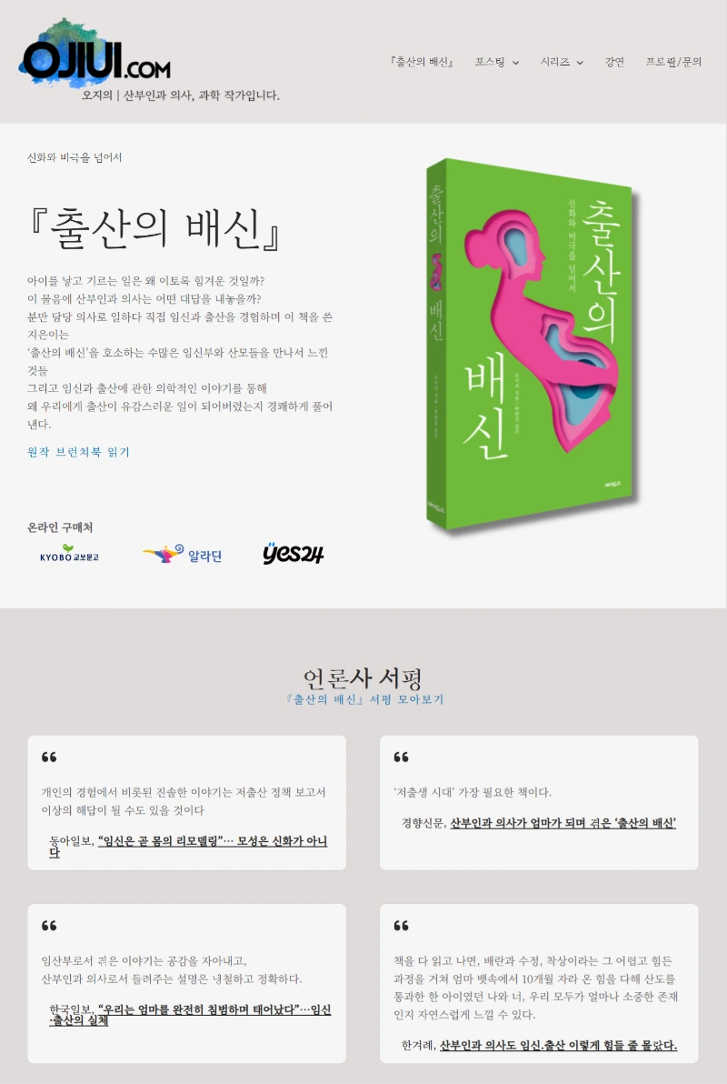 제 홈페이지의 첫 영역은 제가 쓴 유일한(그래서 무척 소중한) 책 소개와 구매 링크입니다. 제가 가진 콘텐츠 중 가장 유효한 것이니까요. 저도 '백만 구독자 인플루언서!' '출간 즉시 n주간 베스트셀러!!!'같은 홍보 문구를 붙이고 싶지만 안타깝게도 해당 사항이 없습니다... 대신 책에 대한 기자단의 평가는 과분할 정도로 좋았기 때문에 이를 인용했습니다. 제 소개는 그다음 영역입니다. 작가를 보고 책을 선뜻 구매할 만큼 알려진 사람은 아니지만, 산부인과 의사이자 아기 엄마라는 이중적 정체성은 독자층에게 나름 호소력이 있기에 세 번째로 중요하다고 판단했습니다.