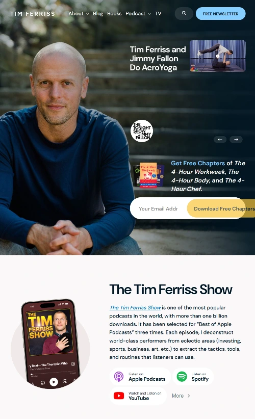 팀 페리스는 자기 계발서 작가이기도 하면서, 팟캐스트도 진행하는 사업가입니다. (이 다양한 정체성 때문에 이 작가에게 웹사이트가 더욱 유효한 것 같습니다. 한 가지 채널에서만 활동하는 크리에이터는 통합적 개인 웹사이트에 대한 관심이 더 낮은 것으로 보입니다.) 보시다시피 첫 화면인 홈페이지를 통해 진행하는 방송도 소개하고, 책도 홍보하고, 블로그 포스팅도 게시합니다. 인물을 강조하는 디자인과 다양한 콘텐츠 배열이 직관적으로 그것을 보여주지요. 동시에 전형적인 흐름을 거스르지도 않기에, 사용자가 이해하기가 어렵지 않습니다.