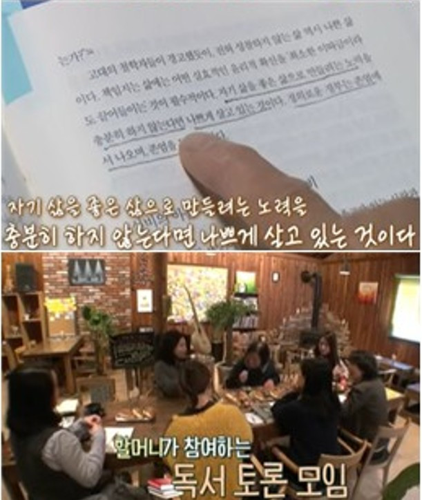 할머니는 책 읽기도 꾸준히 합니다. 책을 읽고 독서모임에 나가는 노년의 삶을 보내시는 거죠. “자기 삶을 좋은 삶으로 만들려는 노력을 충분히 하지 않는다면 나쁘게 살고 있는 것이다.” 할머니가 책에서 한 문장을 읽어주는데 마음에 남았습니다.
