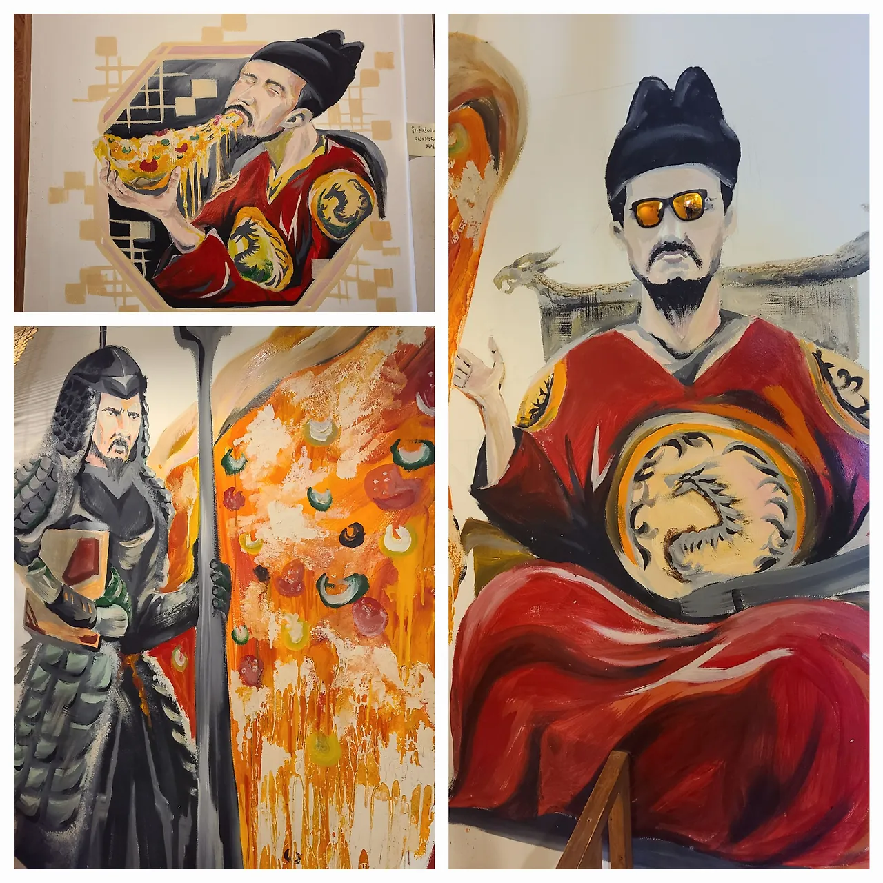 가게 안에 들어서자 인테리어가 개성이 넘친다. 임금님이 선글라스를 낀 벽화? 이순신 장군과 피자 그림? 뜨거운 피자치즈를 쭉 늘어뜨려 맛보는 임금님? 족자에 붓펜으로 써놓은 메뉴판? 옛 교자상 같은 테이블도 어쩐지 정감이 간다.