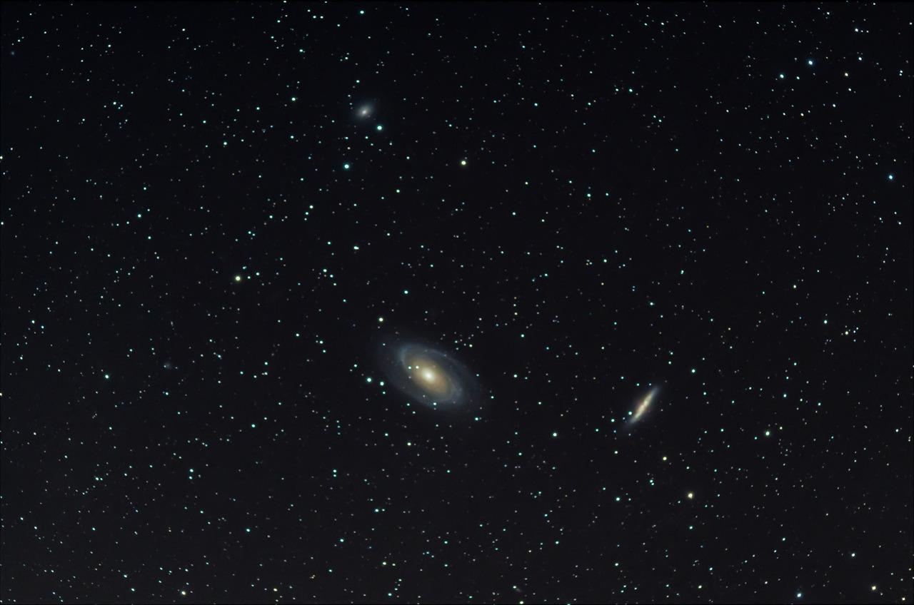 마지막 대상은 큰 곰자리 국자 부분 끝 별인 Bubhe 근처에 있는 M81 보데은하와 M82 시가은하입니다. 보데은하는 1993년 초신성이 발견된 은하로 유명합니다. 크기는 우리 은하와 비슷하고 질량은 태양의 약 2,500배가량 됩니다. 옆에서 쌍을 이르는 시가 은하는 그 모습이 시가를 닮았다 하여 붙여진 이름입니다. 이웃하고 있는 보데은하의 기조력 때문에 모양이 흐트러졌으며 이는 약 1억 년 전쯤부터 시작되었다고 보고 있습니다.