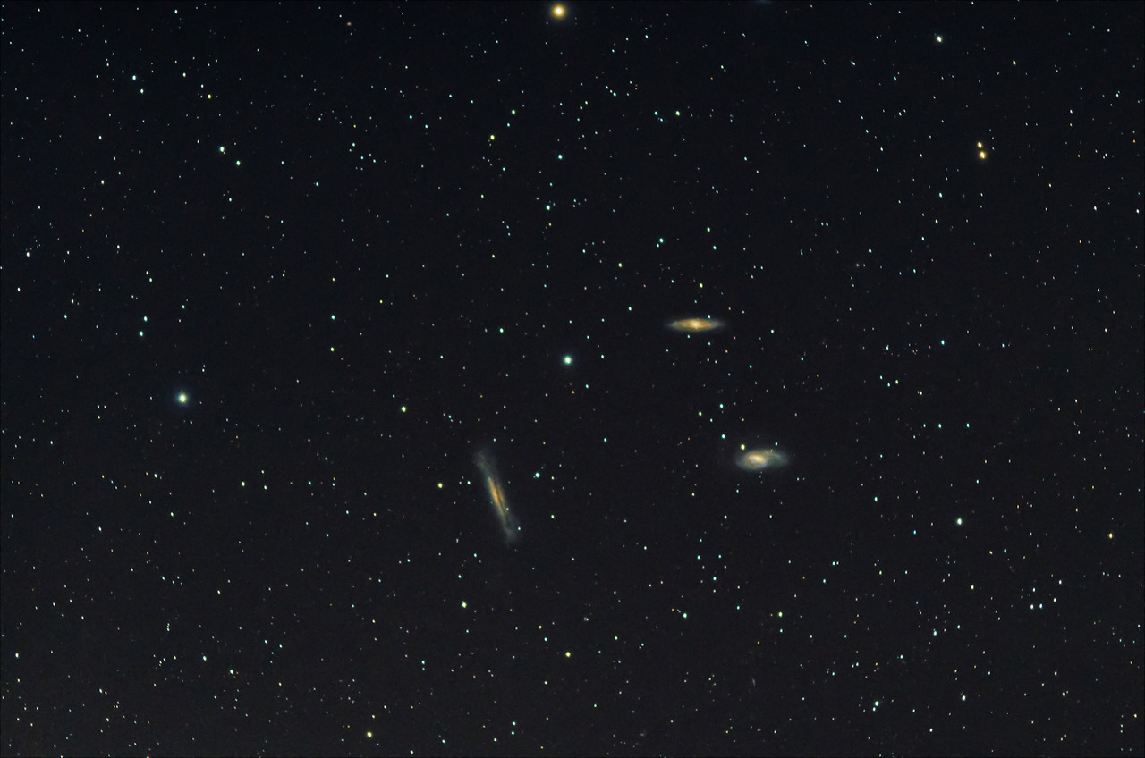다음 대상은 사자자리에 위치한 레오 트리플렛이라는 대상입니다. 사자자리에 있는 은하군인데요 세 은하가 모여있어 트리플렛이라고 부릅니다. 좌측의 길쭉한 은하가 NGC3628, 그리고 상단에 있는 은하가 M65 하단이 M66입니다. 세 은하 다 나선은하의 형태인데 NGC3628만 특이하게 생겼죠? 그 이유는 우리가 보고 있는 부분이 은하의 모서리 면이기 때문입니다. 따라서 우리가 은하수를 볼 때 은하 중심을 바라보며 보이는 암흑 대가 보이는 것이 특징입니다.