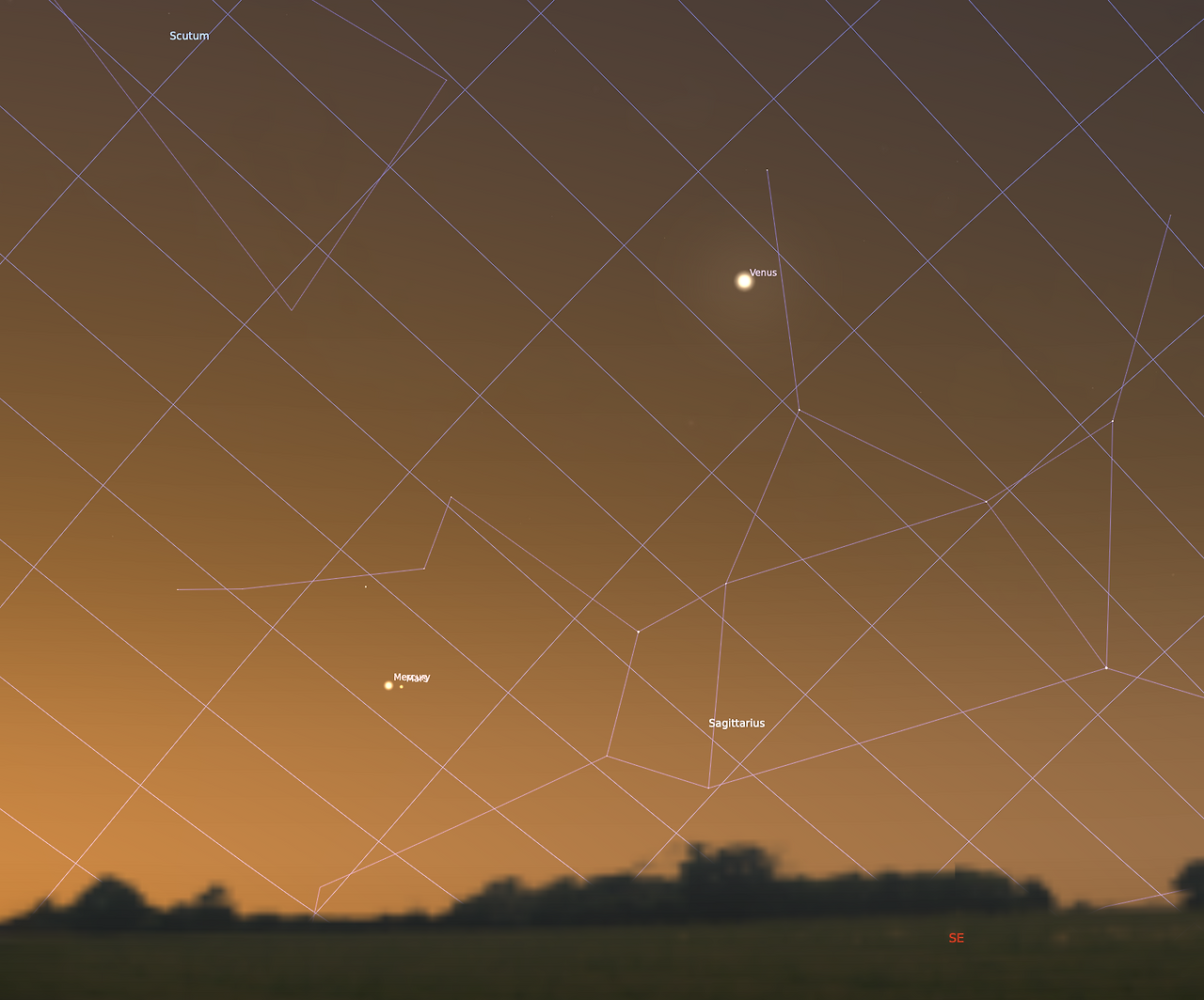 남동쪽 하늘에 매우 밝은 별 하나가 보일 텐데 이 별이 지구 앞쪽 행성인 금성이고 그보다 더 아래방향을 보면 붉은 화성과 함께 수성이 가까이 붙어있는 모습을 볼 수 있게 됩니다. 관측이 가능한 환경이라면 맨눈으로도 볼 수 있겠지만 쌍안경이나 저배율의 망원경등도 관측에는 도움이 될 거 같네요.