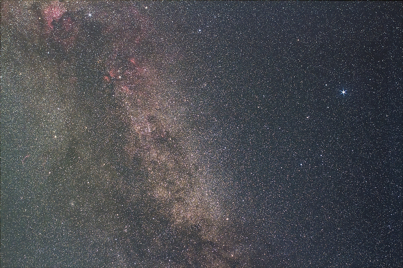 사진을 찍고 보면 무수히 많은 별들을 볼 수 있는데 이는 별들이 모여있는 은하수 영역이기 때문입니다. 사진 중간중간 보이는 붉은 부분은 성운입니다. 이렇게 사진으로 보면 눈으로 보이지 않는 부분들을 많이 볼 수 있게 됩니다.