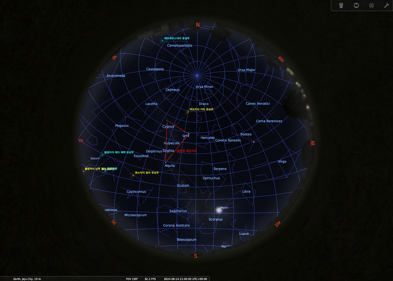본격적으로 여름철의 주인공인 별자리들이 머리 위에 걸리는 시기이기도 합니다. 여름철 대삼각형을 이루는 백조자리 - 거문고자리 - 독수리자리 들이 머리 위로 펼쳐지는 시기인데요 남쪽 궁수자리와 전갈자리 사이에서 시작되는 여름철 은하수가 머리 위 여름철 대삼각형을 지나 북쪽 카시오페아 자리까지 이어지게 됩니다. 요즘 은하수를 맨눈으로 보기란 쉽지 않지만 어느 정도 어두운 곳에서 머리 위 밝게 빛나는 별 세 개를 시야에 담고 핸드폰 밤하늘 모드로 사진을 찍으면 은하수 사진을 얻을 수 있습니다.