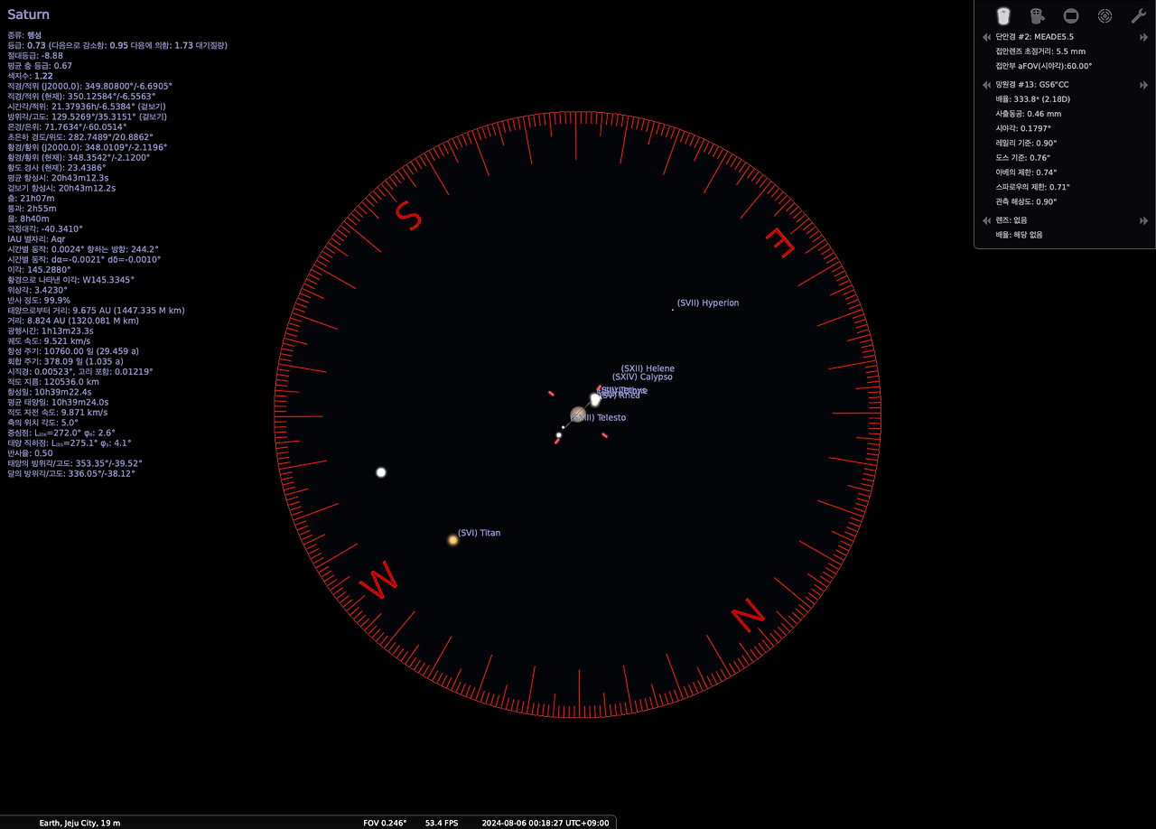 위 이미지는 8월 6일 자정쯤 토성의 관측 예상 모습입니다. 토성은 공전하는 주기에 따라 고리의 모양이 변화하곤 합니다. 15년 주기를 가지고 토성 고리가 사라진 것처럼 보이는 ㅡ 자 모양이 되었다가 다시 기울어지며 우리가 흔히 생각하는 토성의 고리모양으로 변하곤 하는데요. 올해 토성 고리의 위치가 지구 기준으로 측면에서 바라보는 형태가 되어 얇게 ㅡ자 모양에 가깝게 보이게 됩니다.