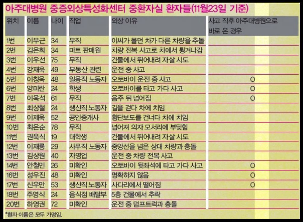 교통사고, 산업 중 재해, 범죄 등으로 인한 부상은 누구에게나 찾아올 수 있다. 하지만 중증외상환자의 대부분은 상대적으로 위험한 환경에 노출되기 쉬운 노동자, 학생, 무직 등의 사람들이다. 한마디로 '힘 없는 사람들'이다. 중증외상환자들을 전담하는 중증외상센터가 운영되고는 있지만 지원금이나 의료진이 턱없이 부족해 의사들의 희생으로 간신히 유지되고 있는 상황이다. 하지만 사람을 살리는 의사들이 고도의 긴장과 집중, 스트레스, 수면부족에 지속적으로 시달리며 사명감만으로 벼텨야 하는 구조에선 환자들의 안전 또한 위험해질 수 있다. 극한의 의료 노동 환경과 부진한 대한민국의 의료시스템 속에서 환자와 의사 모두 죽어가고 있다.
