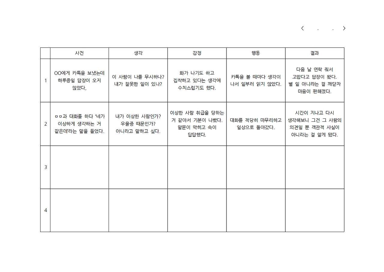 우울감이나 불안을 유발한 사건을 적습니다. 그날 스스로에게 문제적으로 느껴졌던 일을 적는 겁니다. 예를 들면 '누구에게 카톡을 보냈는데 답장이 오지 않았다'는 식입니다. 주관적인 감정이나 생각은 최대한 배제한 채 사건을 서술합니다.