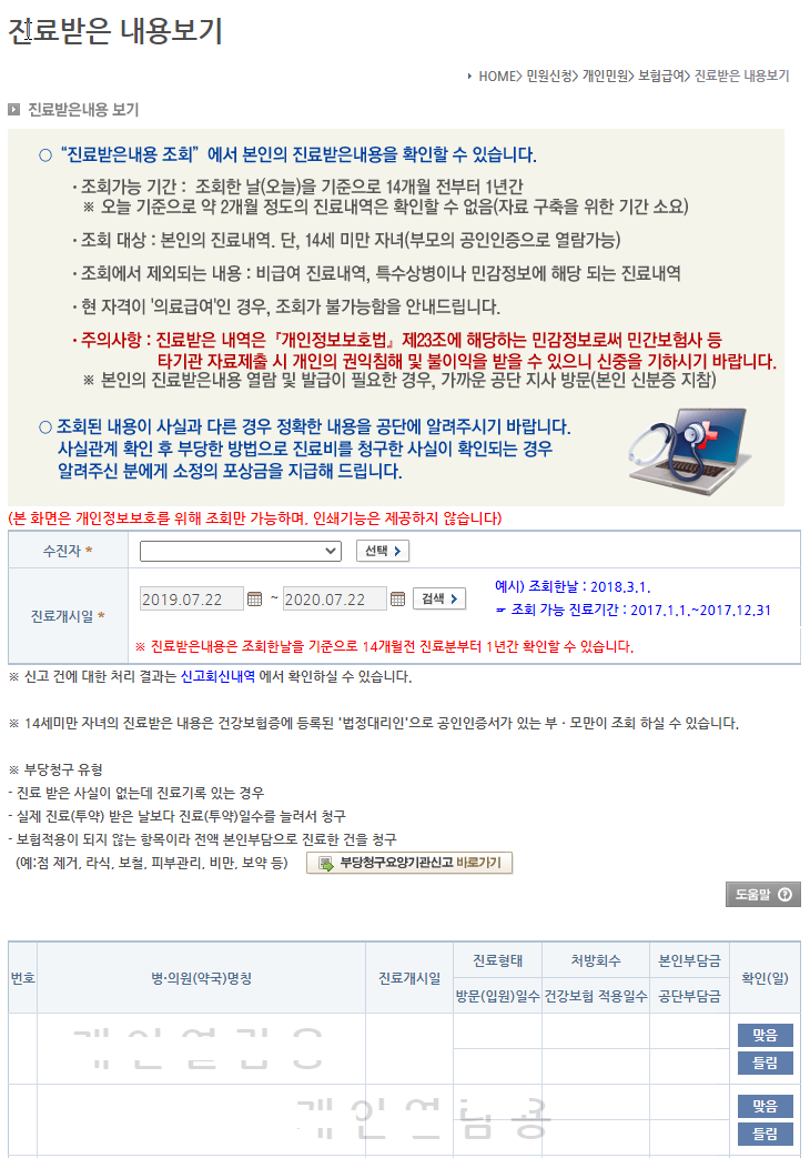 공인인증서로 로그인한 뒤 최근 기록을 검색해보니 14개월 전을 기준으로 하여 1년간의 기록이 조회되었다. 최근 2개월 진료내역은 자료 구축을 위한 기간이 필요해 조회가 불가능하며, 필요한 경우에는 진료를 받은 병, 의원에 문의해야 한다고 했다.