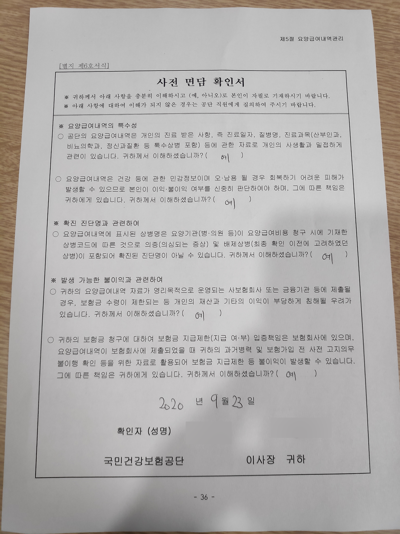 보험사에 나의 병력을 고지해야하는 의무가 있다 해서 보험공단의 기록을 그대로 제출해야 하는 건 아니었다. 오히려 이 경우 민감정보가 오.남용 되거나 보험금 지급 제한 등의 불이익이 있을 수 있다고 했다. 이에 대한 안내를 받았다는 서명을 마치고 나서 기록지를 받았다. 나의 불건강함을 증명하는 작업은 어렵지는 않았지만 조금 번거로웠다. 두툼한 5년간의 진료 기록은 '저는 이만큼 아픈 사람입니다.'라고 말하고 있는 것 같았다. 아픈 사람도 민간보험 가입이 가능한지 알아볼 준비는 이렇게 끝났다.