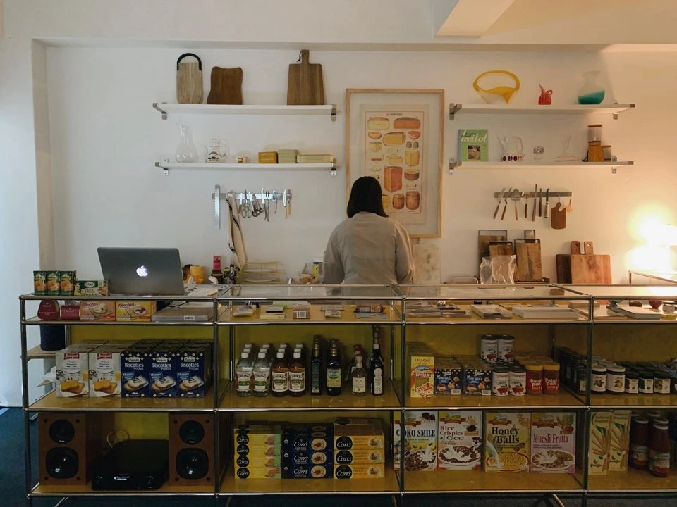 선반에는 치즈와 와인과 함께 먹기 좋은 비스킷부터 파스타, 각종 소스, 글라스 등이 가지런히 놓여있고, 치즈 관련 도구부터, 플레이트까지 마치 치즈 박물관을 연상케 한다. 하지만 무겁지 않다. 전체적인 톤 앤 매너는 차분하면서도 키치하고 재기 발랄하다.