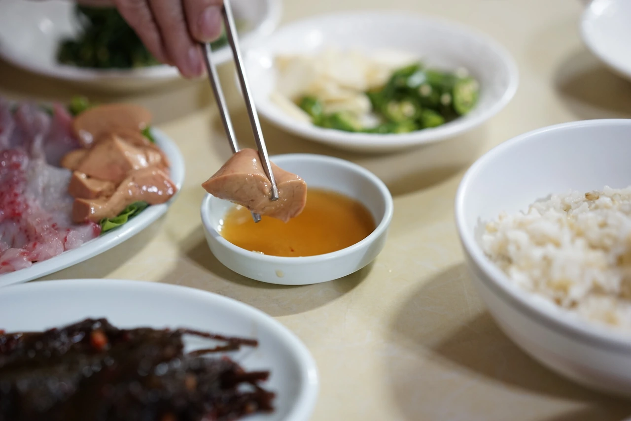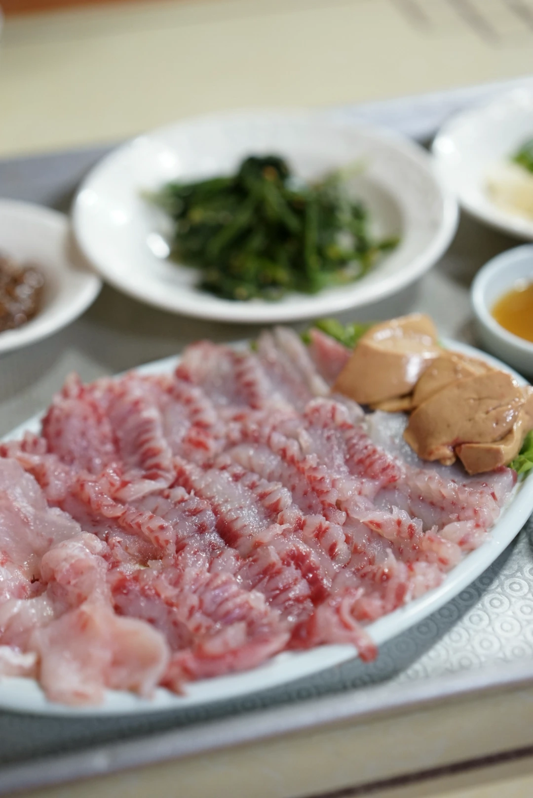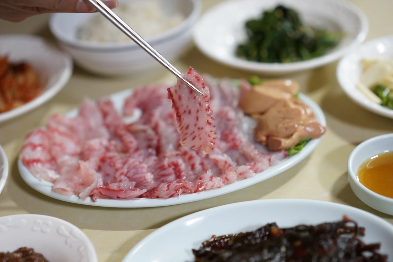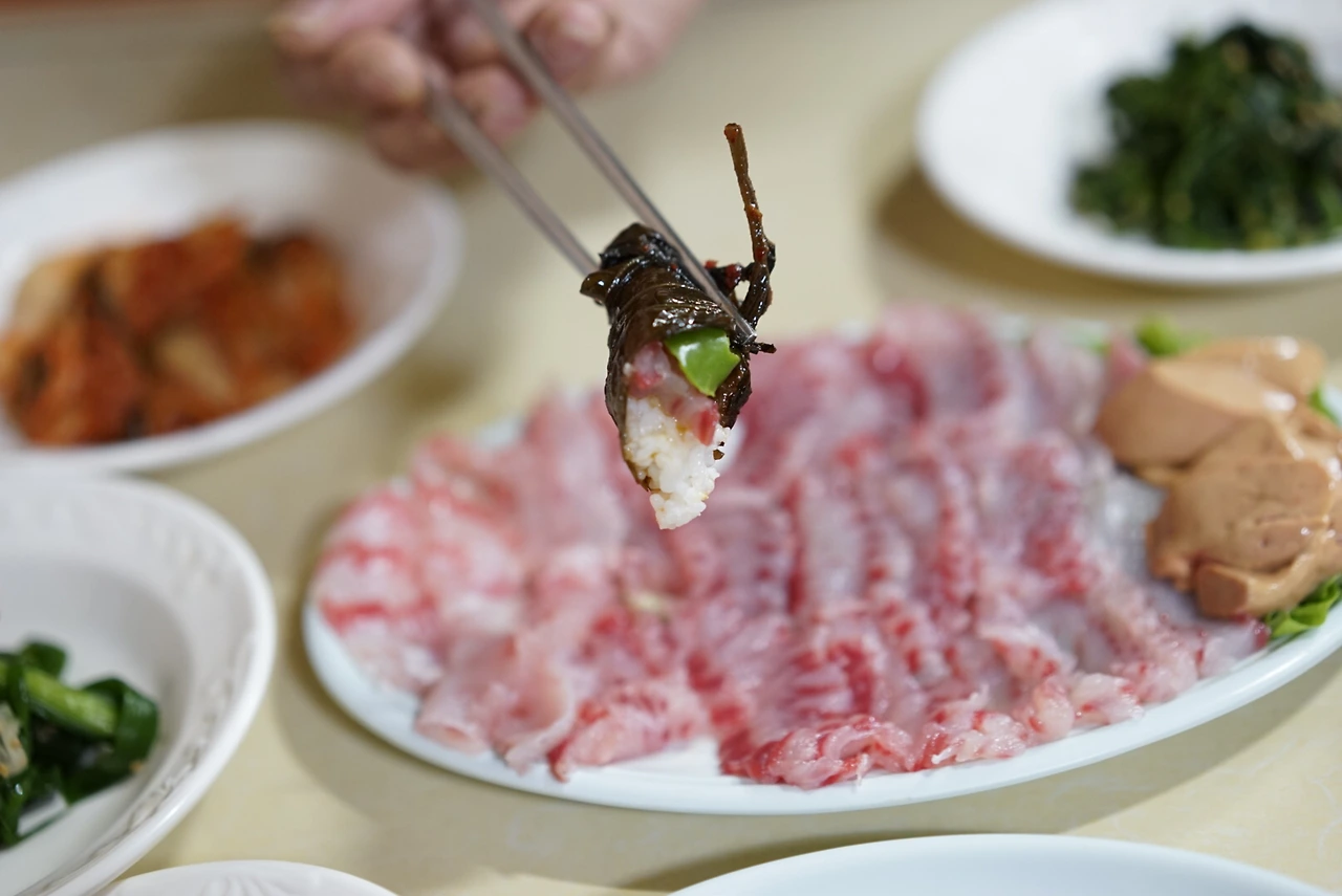 깻잎절임에 밥, 회, 고추를 올리고 싸 먹는 게 이 집에서