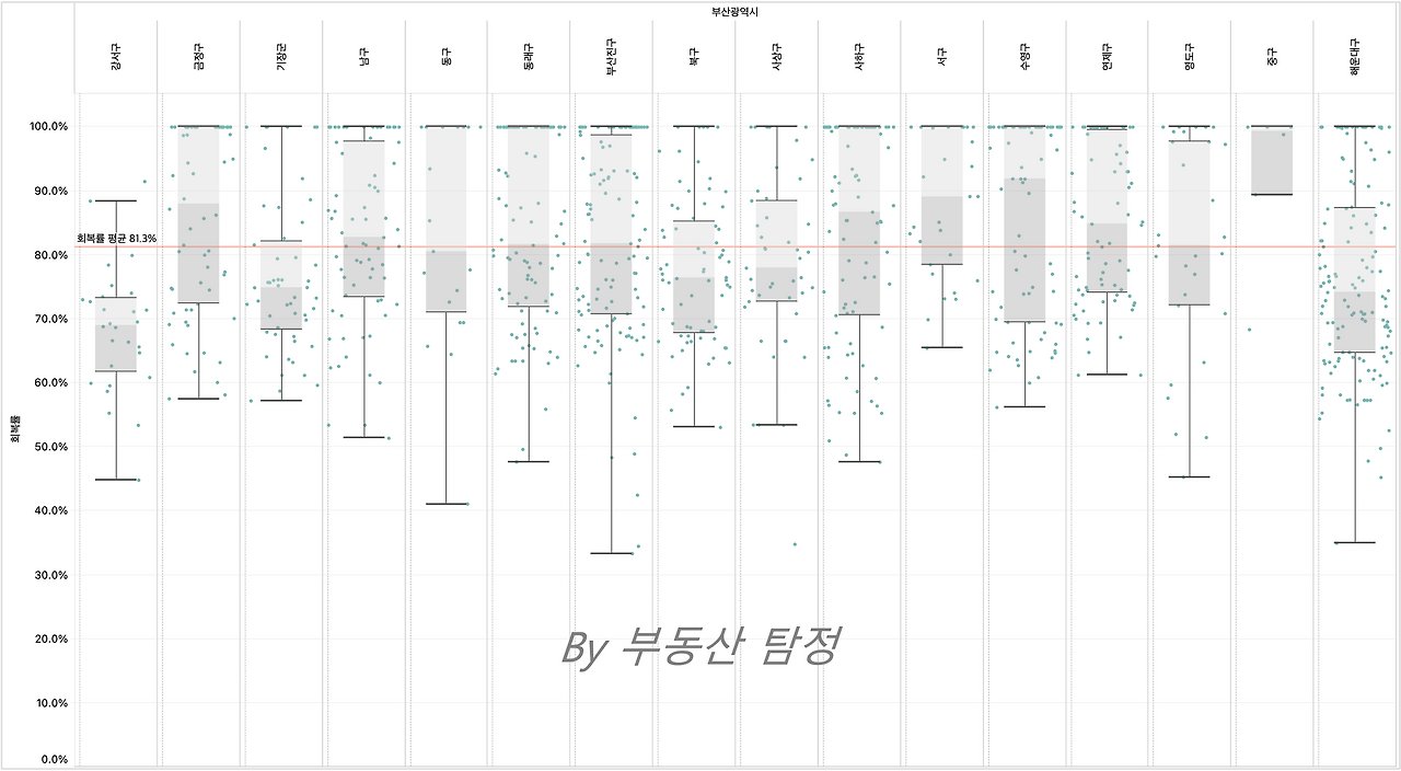 전고점 회복률 평균은 81.3%이나, 전고점 대비 30% 내외로 하락한 단지들도 수두룩하다.