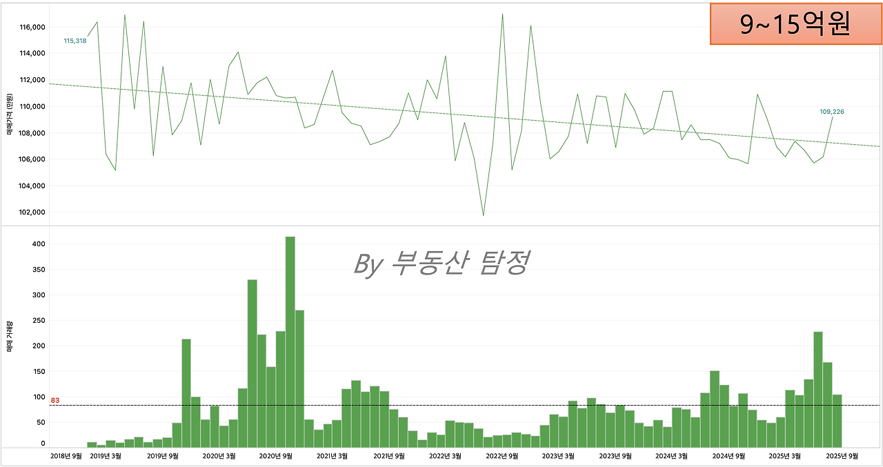 9~15억원 : 지방에서는 상대적으로 비싼 가격으로 입지 좋은 곳은 비교적 회복했으나, 21년 오버 슈팅으로 거래된 단지들은 아직 회복이 안됨.