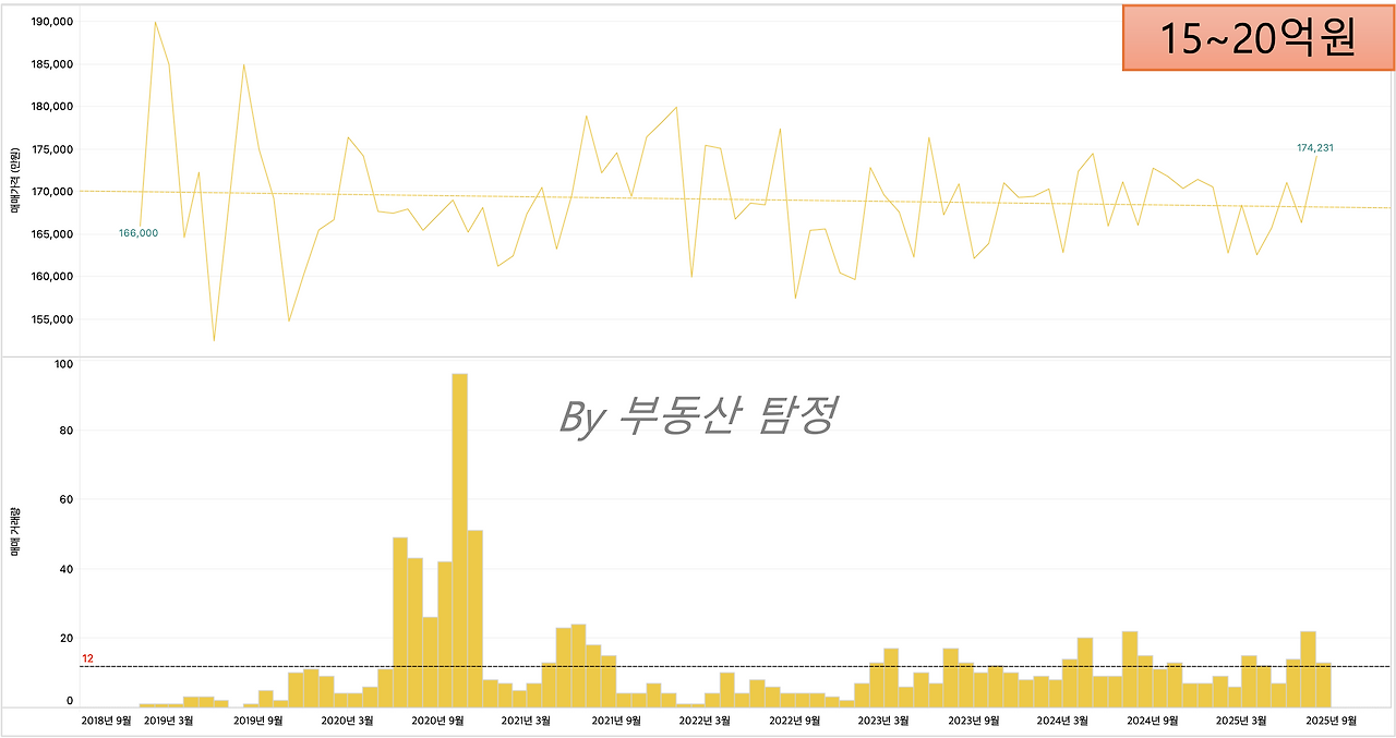 15~20억원 : 지방에서는 상대적으로 비싼 가격으로 입지 좋은 곳은 비교적 회복했으나, 21년 오버 슈팅으로 거래된 단지들은 아직 회복이 안됨.