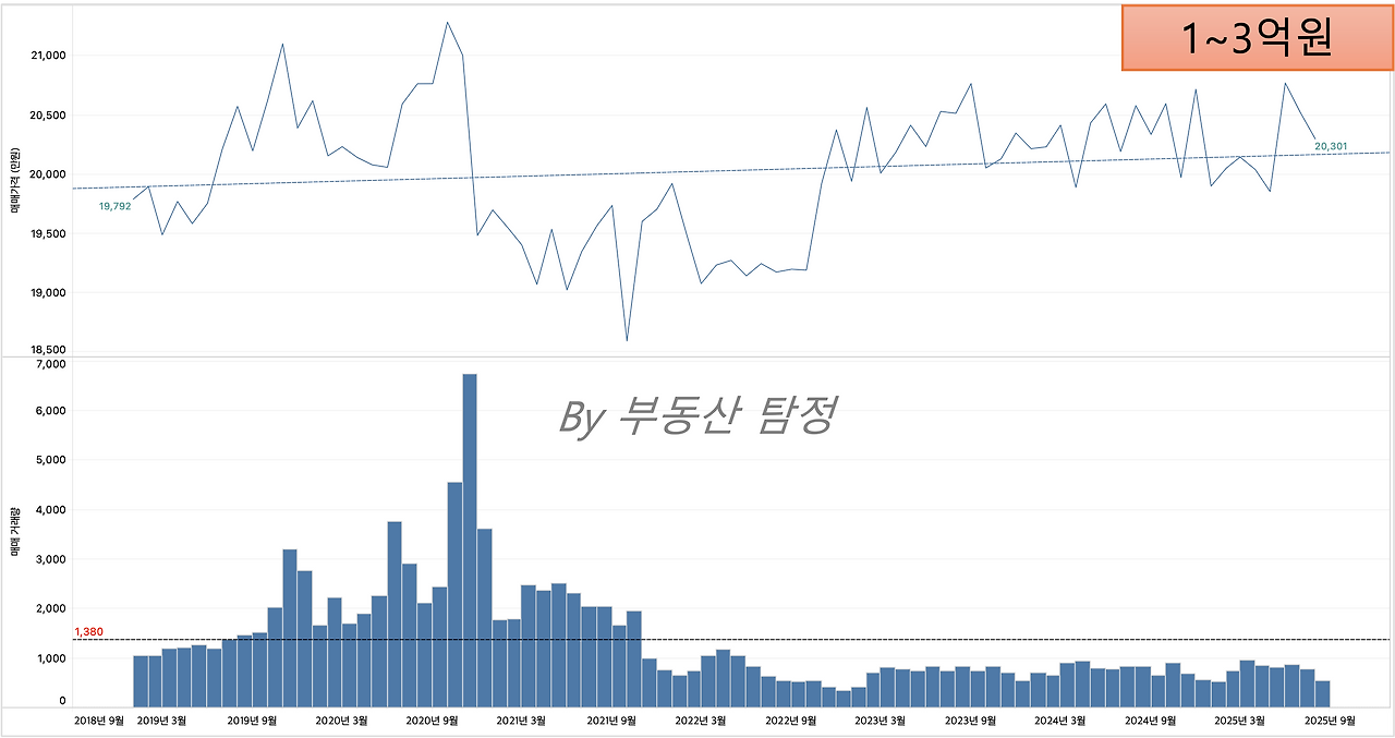 1~3억원 : 입지나 떨어지거나 구축 단지들로 아직 전고점 회복 안됨.