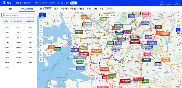 아실에서는 교통망 개발 정보를 한눈에 볼 수 있어서 매우 유용하다. 아래 그림에서 색깔쳐진 영역이 정비사업 구역이다. 초기/중기/후기에 따라 선택해서 볼 수도 있다.