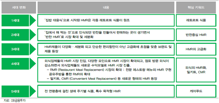 레토르트 형태의 1세대 HMR과 반찬중심 HMR인 2세대를 지나서 고급화와 다양성이 포함된 3세대 HMR이 완성되고 있다. 이런 환경은 B2B경로인 외식에도 접목이 되어서 RMR, 밀키트와 같은 4세대로 진입을 했으며, 빠른 시간 내에 케어푸드인 5세대 HMR이 시작될 것이라 예상되고 있다.