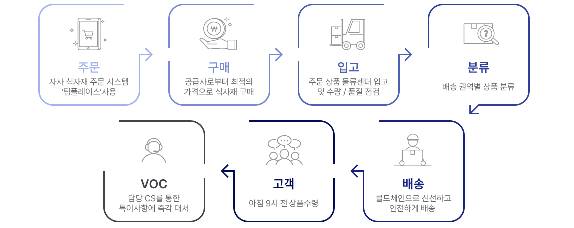 이후 신선 일배상품은 협력사로 발주 정보가 전달되고, 이 정보에 맞추어서 소분한 물량을 물류센터에 오후 12시 이전에 입고시킨다.